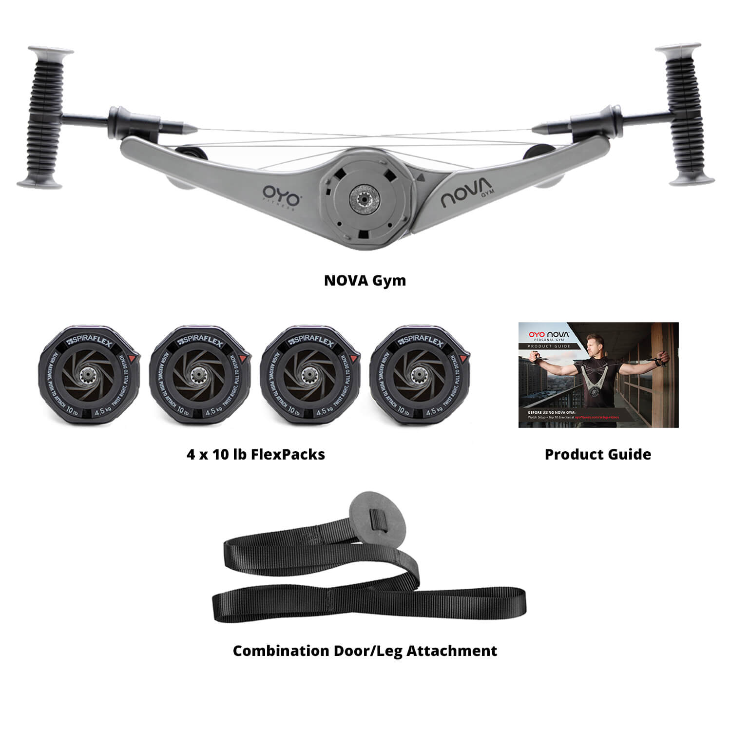 The NOVA Gym is a full body portable gym for exercise at home, office, or on the go. SpiraFlex FlexPacks snap on to provide up to 40 lbs of resistance in 10 lb increments. Each NOVA Gym comes with: