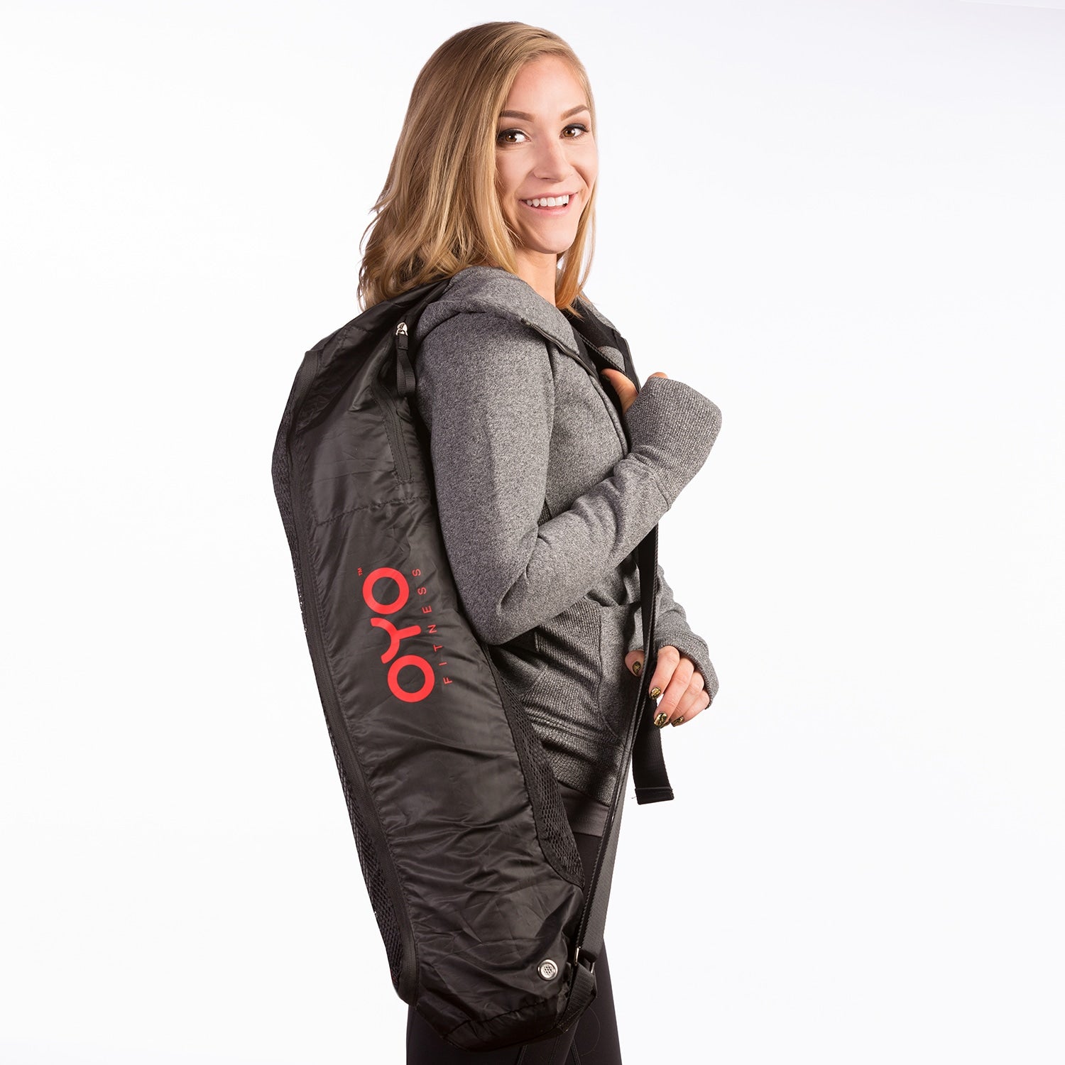 The OYO Fitness Carry-All Shoulder Bag is the perfect solution for carrying your OYO Personal Gym, exercise/yoga mat, and accessories. Stylish and convenient, you can carry your workout with you wherever you go. Our shoulder bag is made from a durable nylon and features a central compartment for your exercise mat, an outer mesh zippered pocket for your OYO Personal Gym, two additional zippered pockets for accessories, and a mesh pouch that can easily fit your water bottle or shaker bottle.